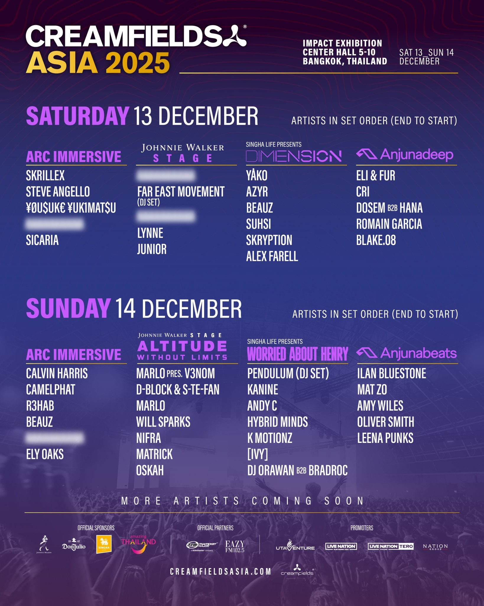 From Dec 13, Thailand will host Creamfields Asia 2025 for a full 2 days, This article includes the most complete performance timetable, live stream details, program, venue information, and lineup, including set times and schedule.