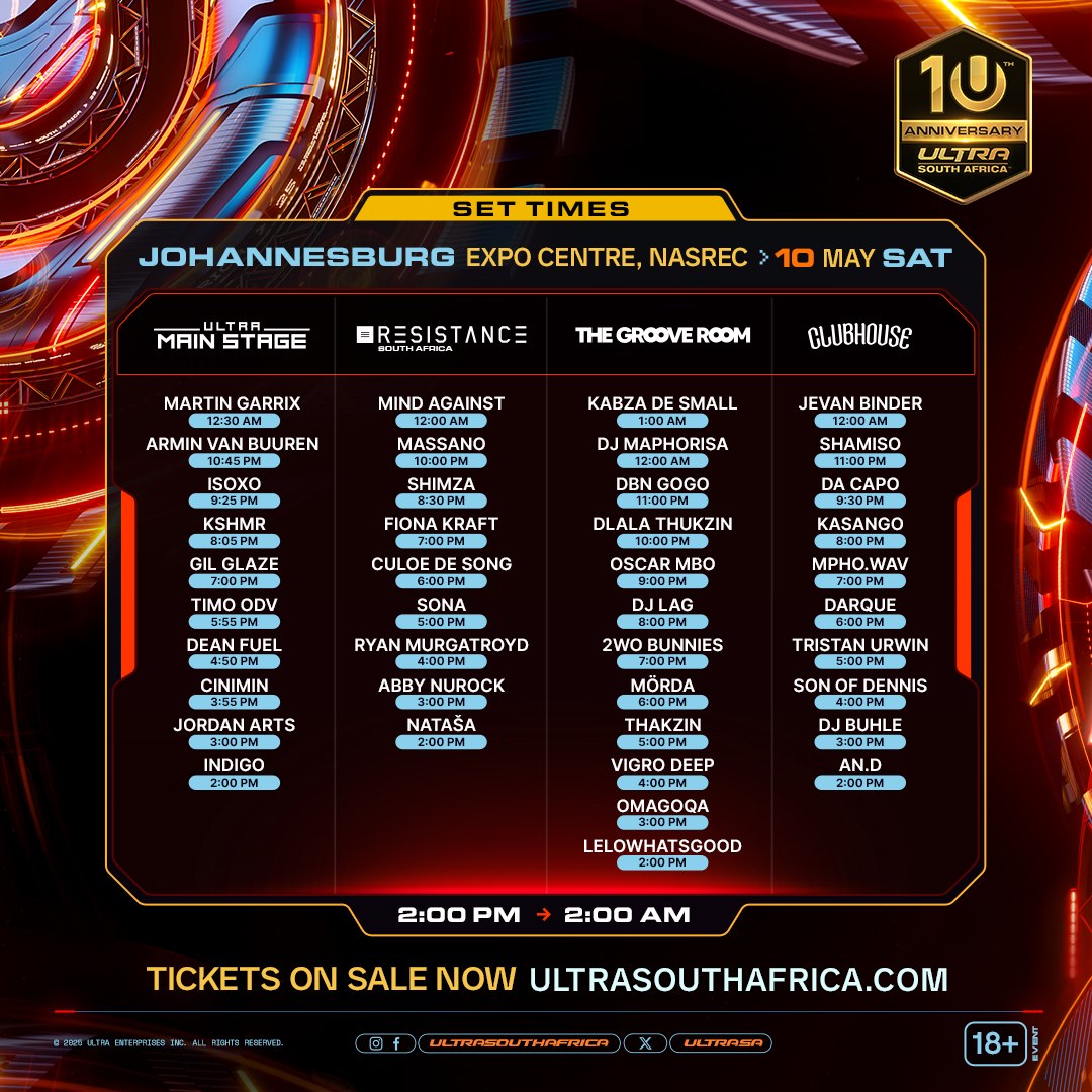 Ultra South Africa 2025‧Johannesburg takes place in South Africa from May 10, featuring 1 days of performances and fun, Armin van Buuren, ISOxo, KSHMR, Martin Garrix will headline, Whether it's lineup, set times, schedule, live stream, or venue map, we’ve got everything you need in one place, including full timetable and performance details.