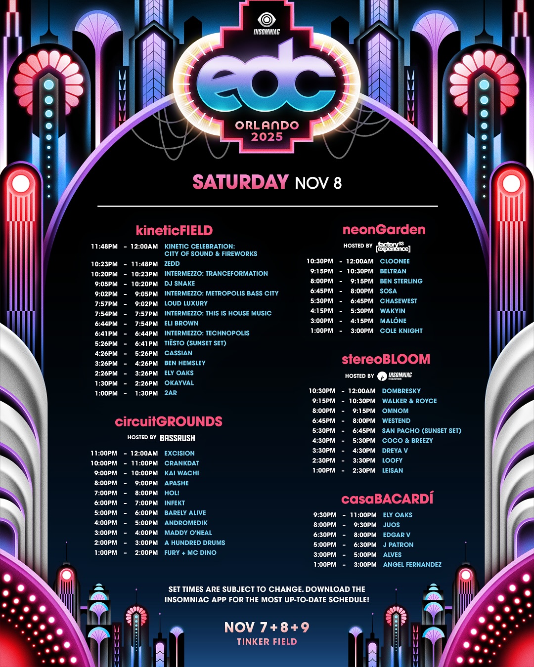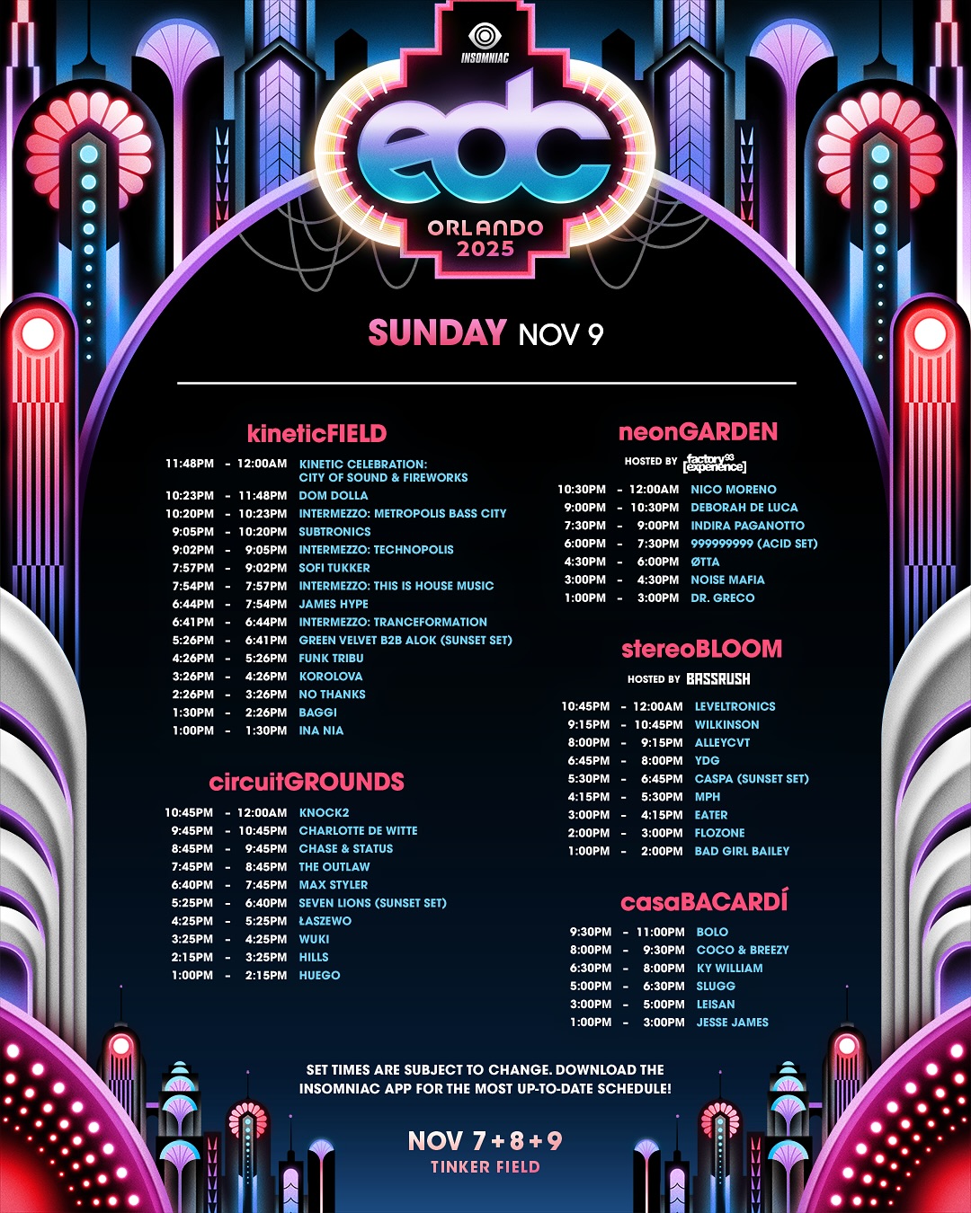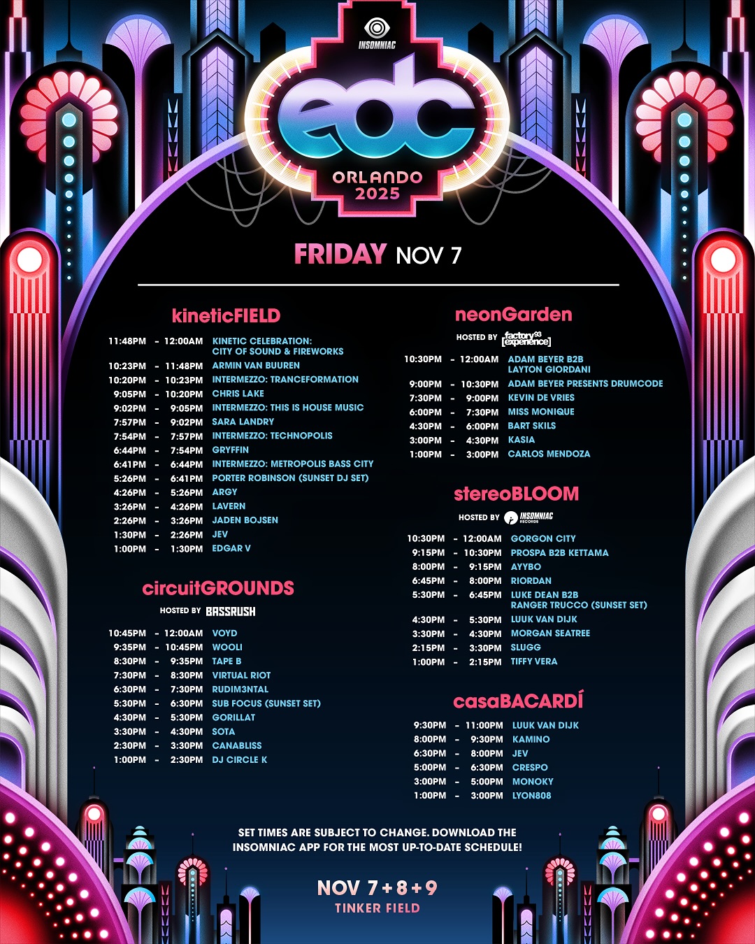 EDC Orlando 2025(Electric Daisy Carnival), Below is the entire live stream, location, map, full set times, timetable, lineup and schedule.