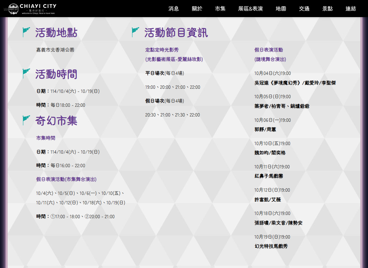 sábado 04 viernes 10 Yunlin International Puppet Theater Festival 2025 Opening Concertvie., 10 de oct. Yunlinsábado 11 sábado 11 Lukang Music Festival 2025 @ Lukang Stadiumsáb., 11 de oct. -dom., 12 de oct. Changhuasábado 18 Lukang Music Festival 2025 @ Baguashan Great Buddhasáb., 18 de oct. -dom., 19 de oct. Changhuasábado 18 The 114th National Games in Yunlin County - Athletes’ Nightsáb., 18 de oct. Yunlinsábado 25 viernes 31