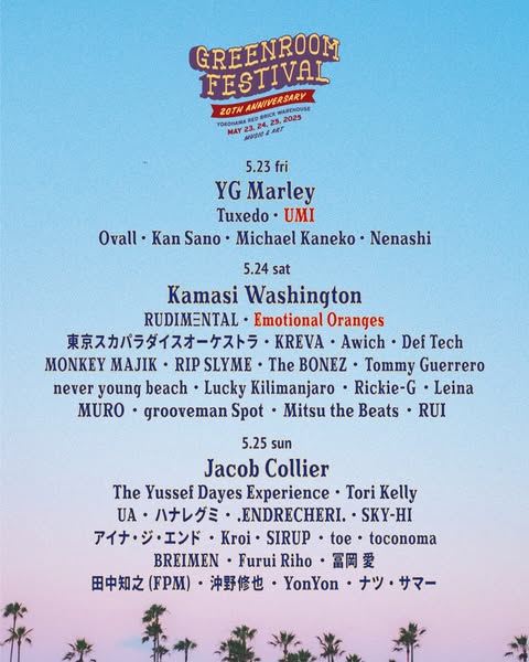 GREENROOM FESTIVAL 2025が5月23日より日本にてスタート!3日間にわたって開催、YG Marleyはプレパーティーに出演し、Kamasi Washingtonは1日目に出演し、JACOB COLLIERは2日目に出演し、最も完全なパフォーマンススケジュールを確認してください。ラインアップ、セットタイム、プログラム、会場マップ、タイムテーブル、ライブストリーム、スケジュールが含まれています。