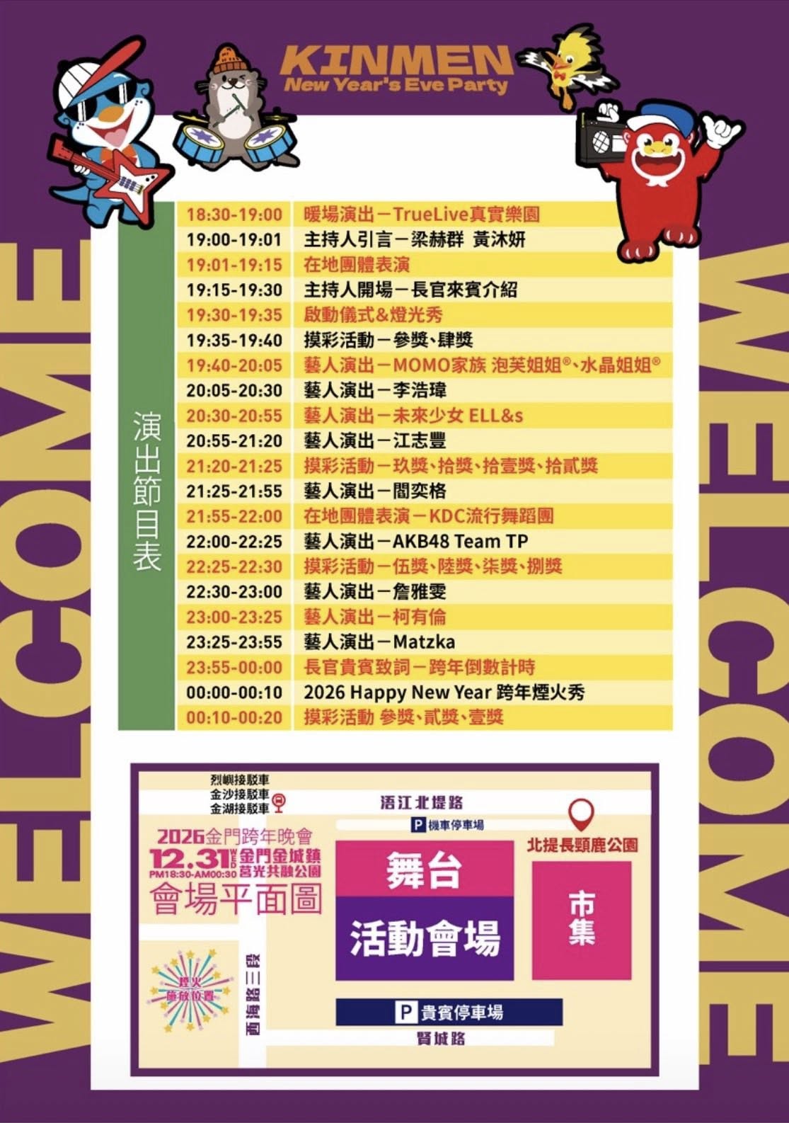 行事历全球音乐节活动不断登场,免费场次也越来越多。FestTimetable 精选独立、流行、电子与 KPOP 音乐节最新攻略,适合热爱音乐与文化的你,快约上朋友一起嗨起来吧!美国 英国 西班牙 台湾 中国 日本 韩国 今年活动一览12月星期五05INSPIRE TOKYO 2025 WINTER12月5日(五)-12月7日(日)东京都活动介绍官方网站TwitterInstagram星期五05500趴202512月5日(五)-12月7日(日)台北活动介绍官方网站InstagramFacebook星期五052025年苗栗山酿青春音乐会12月5日(五)-12月6日(六)苗栗活动介绍Facebook星期六06BLAZE UP NAGASAKI 202512月6日(六)-12月7日(日)长崎县活动介绍官方网站TwitterInstagram星期六06TOHOKU MUSIC JOURNEY 202512月6日(六)-12月7日(日)宫城县活动介绍官方网站Twitter星期六06ONE STEP LIVE 202512月6日(六)静冈县活动介绍官方网站TwitterInstagram星期六06下北沢にて'2512月6日(六)东京都活动介绍TwitterInstagram星期六062025年万华大闹热·艋舺有嘻哈12月6日(六)台北活动介绍Facebook星期六062025年台北青年理想生活节12月6日(六)-12月7日(日)台北活动介绍InstagramFacebook星期六06Big Mountain Music Festival 202512月6日(六)-12月7日(日)那空叻差是玛活动介绍InstagramFacebook星期六062025年山海回响花莲声浪演唱会12月6日(六)花莲活动介绍InstagramFacebook星期日07MONTREUX JAZZ FESTIVAL JAPAN 202512月7日(日)神奈川县活动介绍官方网站TwitterInstagramFacebook星期日072025年艋舺青山王音乐祭12月7日(日)台北活动介绍官方网站InstagramFacebook星期五122025年彰化社頭織襪芭樂觀光節12月12日(五)-12月14日(日)彰化活动介绍Facebook星期五122025年漂游者森林音乐祭12月12日(五)-12月14日(日)台中活动介绍官方网站InstagramFacebook星期五122025年嘉义大舞台12月12日(五)-12月19日(五)嘉义活动介绍官方网站InstagramFacebook星期六13Creamfields Asia 202512月13日(六)-12月14日(日)曼谷活动介绍InstagramFacebook星期六13结びの梦番地202512月13日(六)-12月14日(日)广岛县活动介绍官方网站TwitterInstagram星期六13響都超特急202512月13日(六)-12月14日(日)京都府活动介绍官方网站TwitterInstagram星期六13驳二港边露营趣12月13日(六)-12月14日(日)高雄活动介绍官方网站星期六132025年OPEN!大气球游行12月13日(六)高雄活动介绍InstagramFacebook星期六13音泉温楽2025・冬12月13日(六)-12月14日(日)长野县活动介绍官方网站TwitterInstagramFacebook星期六132025年北流耶诞小镇12月13日(六)-12月21日(日)台北活动介绍官方网站InstagramFacebookYouTube星期六132025下酒祭:音乐、啤酒、下酒菜 FEAT.韩国 한국12月13日(六)-12月14日(日)高雄活动介绍官方网站InstagramFacebook星期六132025 MUSIC BANK GLOBAL FESTIVAL IN JAPAN12月13日(六)-12月14日(日)东京都活动介绍官方网站TwitterInstagram星期六132025年青洲湾暖冬派对12月13日(六)-12月27日(六)屏东活动介绍Facebook星期六132025金沙歡樂聖誕×時光繁星假日市集─開幕晚會12月13日(六)金门活动介绍Facebook星期六132025新北欢乐耶诞城·巨星耶诞演唱会12月13日(六)-12月14日(日)新北市活动介绍官方网站InstagramFacebookYouTube星期六132025年西拉雅5COOL音乐节12月13日(六)-12月14日(日)台南活动介绍Facebook星期六132025年出口音乐节12月13日(六)台北活动介绍Facebook星期日14年末調整GIG 202512月14日(日)爱知县活动介绍官方网站TwitterInstagram星期五192025宿造好聲音聖誕特別場12月19日(五)台中活动介绍Instagram星期五192025年苗栗耶诞城12月19日(五)-12月24日(三)苗栗活动介绍Facebook星期六20MERRY ROCK PARADE 202512月20日(六)-12月21日(日)爱知县活动介绍官方网站Twitter星期六202025年Feeling18耶诞小镇12月20日(六)-12月21日(日)南投活动介绍官方网站Facebook星期六202025年高流圣诞趴12月20日(六)-12月25日(四)高雄活动介绍官方网站InstagramFacebook星期六202025高雄圣诞生活节·公园大舞台12月20日(六)-12月24日(三)高雄活动介绍官方网站星期六202025年基隆年终演唱会12月20日(六)基隆活动介绍Facebook星期六202025年梦时代星空音乐日12月20日(六)-12月21日(日)高雄活动介绍官方网站星期六202025年彰化岁末演唱会12月20日(六)彰化活动介绍官方网站星期六202026台南市耶诞跨年系列活动-摇滚耶诞演唱会12月20日(六)台南活动介绍官方网站InstagramFacebook星期五26FM802 ROCK FESTIVAL RADIO CRAZY 202512月26日(五)-12月29日(一)大阪府活动介绍官方网站TwitterInstagram星期六27COUNTDOWN JAPAN 25/2612月27日(六)-12月31日(三)千叶县活动介绍官方网站TwitterInstagramYouTube星期六27木島平 SNOW LOVERS 愛とか、恋とか、出会いとか12月27日(六)长野县活动介绍官方网站TwitterInstagramFacebook星期六27古镇飞扬宝斗狂飨曲12月27日(六)彰化活动介绍Facebook星期六272025年头份岁末演唱会12月27日(六)苗栗活动介绍Facebook星期六272026台南市耶诞跨年系列活动-南瀛草地音乐会12月27日(六)台南活动介绍官方网站InstagramFacebook星期日282025闪耀Boom水里星光岁末演唱会12月28日(日)南投活动介绍官方网站Facebook星期二30KOBE MUSIC COMMONS 202512月30日(二)兵库县活动介绍官方网站TwitterInstagram星期二30CIRCUS×CIRCUS 202512月30日(二)大阪府活动介绍官方网站TwitterInstagram星期三312026紫耀义大义享奔腾跨年烟火秀12月31日(三)高雄活动介绍官方网站Facebook星期三3153rd New Year Rock Festival 2025-202612月31日(三)-1月1日(四)东京都活动介绍官方网站TwitterInstagramFacebook星期三312026闪耀新北1314跨河烟火·淡水渔人码头12月31日(三)新北市活动介绍官方网站星期三312026闪耀新北1314跨河烟