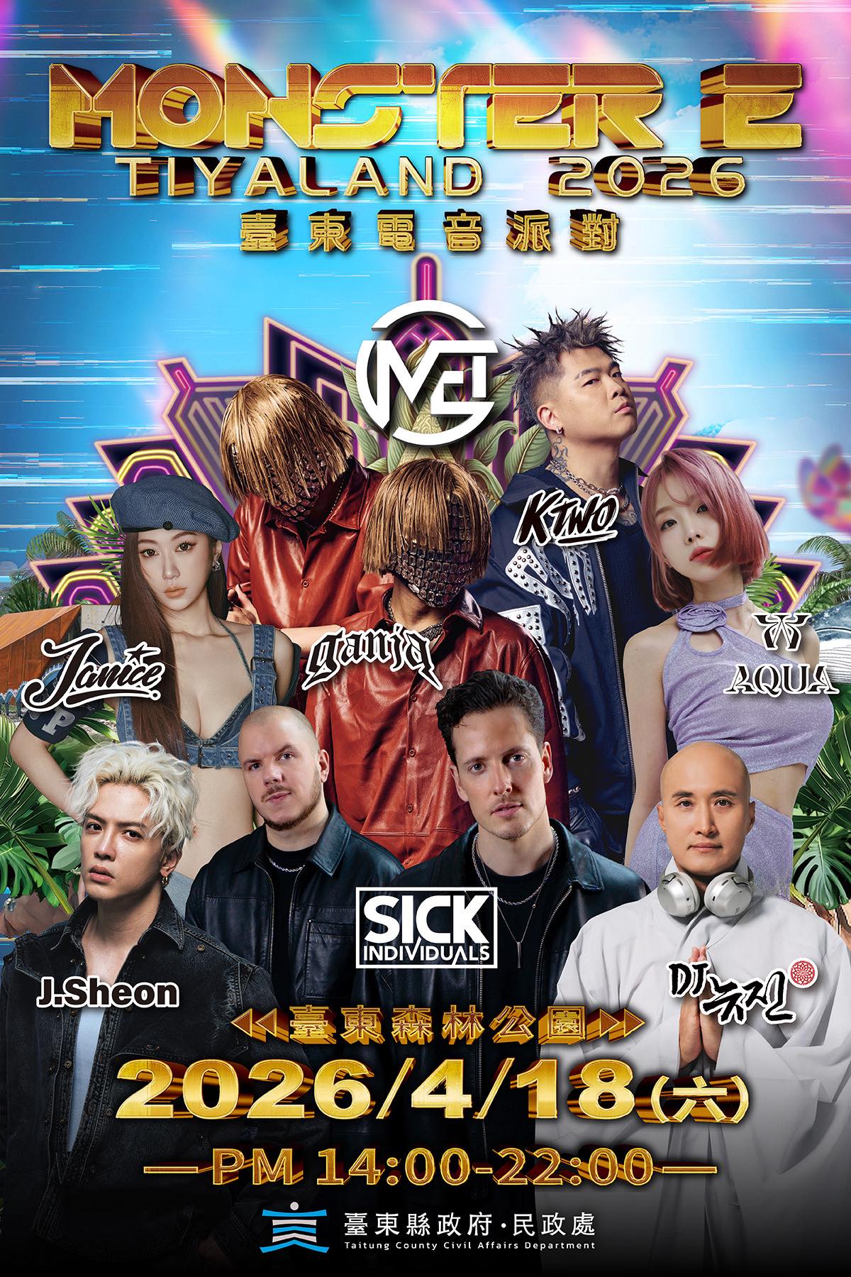 2026年台东电音派对4月18日(六)2026年台东电音派对将在台湾举办,为期1天。本活動完全免费。2026年台东电音派对(Monster E Tiyaland 2026),最完整的演出阵容、电视直播信息、线上直播、节目表、时间表、会场地图、场地信息、时程表、Live Stream、Lineup、Set Times、Timetable和Schedule都在这里。相关连结:FacebookFacebook 分享TwitterFacebookLine会场位置演出阵容时间表会场地图活动日期2026年4月18日(六)开始时间14:00结束时间22:00主页全部活动2026年台东电音派对会场位置台东森林公园 Google Maps台东县台东市华泰路300号演出阵容J.SheonSick IndividualsDJ AQUA活动有J.Sheon、Sick Individuals、DJ AQUA等知名表演目前公布的演出阵容共有9组,详情如下:太陽下山JANICE CHENCHARLIE'S ANGLESDJ AQUAGANJAJ.SheonNEWJEANSNIMSick IndividualsKTWO太陽下山JANICE CHENCHARLIE'S ANGLESDJ AQUAGANJAJ.SheonNEWJEANSNIMSick IndividualsKTWO如需了解2026年台东电音派对的完整演出阵容,请参考下方图片,内容以官方最新更新为准。查看高清图点击上方图片查看2026年台东电音派对的演出阵容的高清大图时间表2026年台东电音派对的时间表已发布,可通过下方图片查看,内容以最新官方更新为准。查看高清图点击上方图片查看2026年台东电音派对的时间表的高清大图会场地图查看高清图点击上方图片查看2026年台东电音派对的会场地图的高清大图本页面于2026年4月16日更新,活动信息仅供参考,实际内容请以主办方官方公告为准