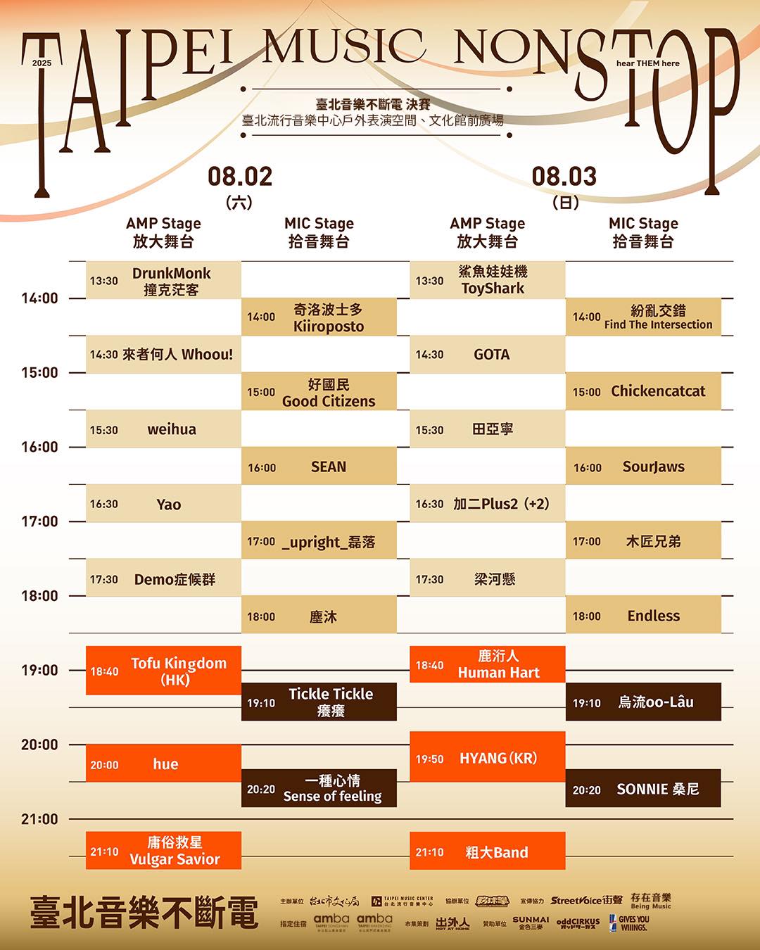 2025年台北音乐不断电决赛8月2日(六)-8月3日(日)2025年台北音乐不断电决赛将在台湾举办,为期2天。2025年台北音乐不断电决赛(Taipei Music Non-stop Final 2025),最完整的演出阵容、电视直播信息、线上直播、节目表、时间表、会场地图、场地信息、时程表、Live Stream、Lineup、Set Times、Timetable和Schedule都在这里。相关连结:InstagramFacebookYouTubeInstagramFacebookYouTube 分享TwitterFacebookLine会场位置时间表活动日期第1天2025年8月2日(六)开始时间13:30结束时间21:40第2天2025年8月3日(日)开始时间13:30结束时间21:40主页全部活动2025年台北音乐不断电决赛会场位置西门红楼 Google MapsNo. 10, Chengdu Rd., Wanhua Dist., Taipei City 108006, Taiwan (R.O.C.)时间表2025年台北音乐不断电决赛的时间表已发布,可通过下方图片查看,内容以最新官方更新为准。查看高清图点击上方图片查看2025年台北音乐不断电决赛的时间表的高清大图本页面于2025年7月22日更新,活动信息仅供参考,实际内容请以主办方官方公告为准