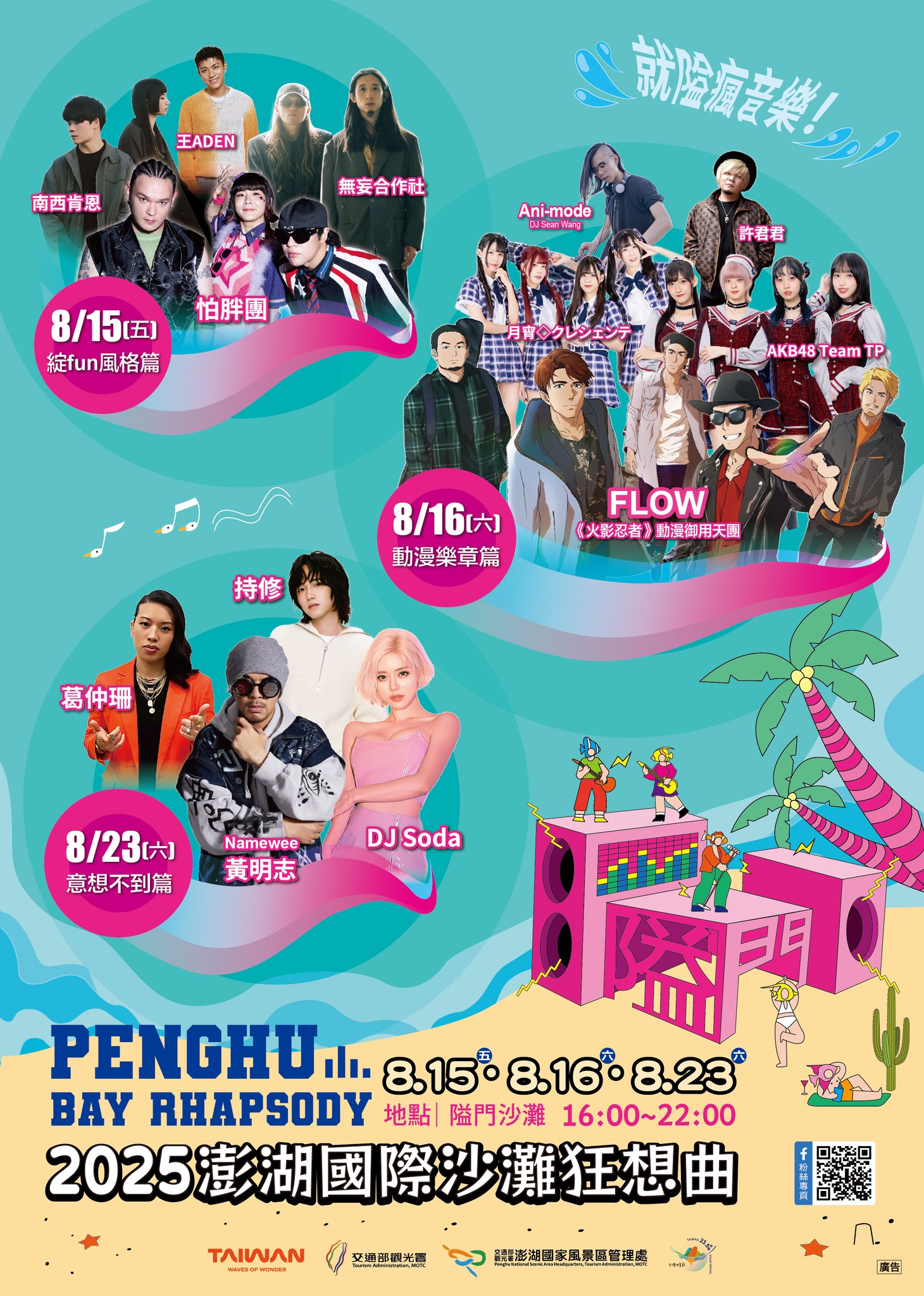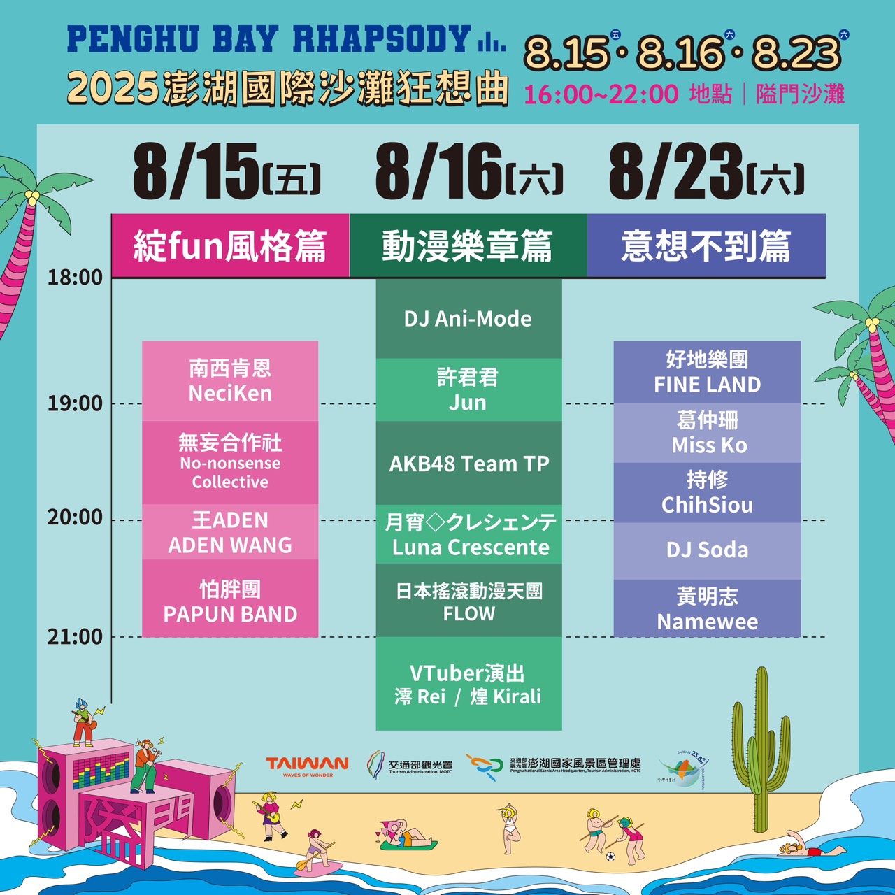 精彩的2025年澎湖國際沙灘狂想曲(PENGHU BAY RHAPSODY 2025)活動預計於8月15日在台灣展開,持續3天熱鬧登場,想快速找到Lineup、時間表、節目表、Live Stream或場地地圖嗎?所有關於演出和直播的資訊都在這裡,應有盡有。