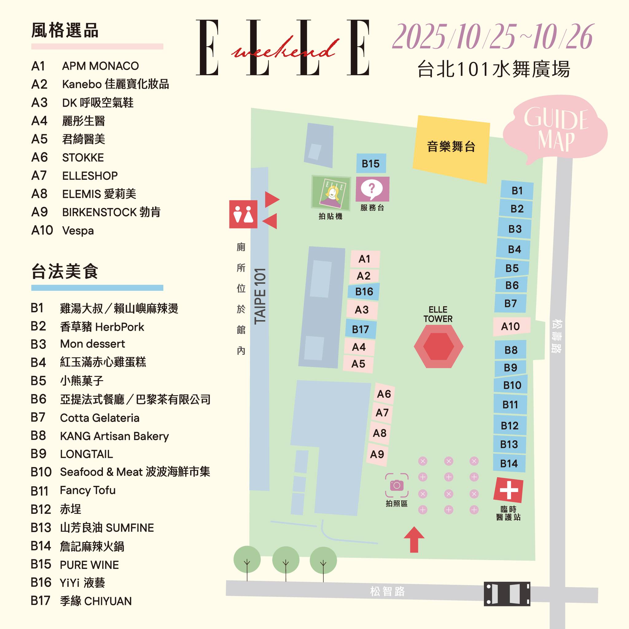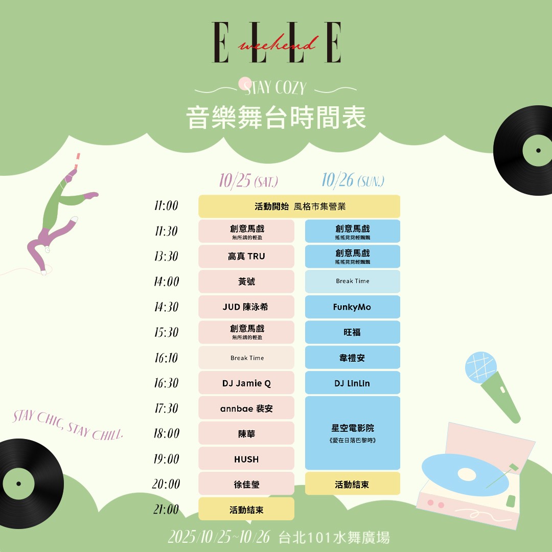 時間表線上直播搜索相片會場位置演出陣容 分享TwitterFacebookLine2025 ELLE Weekend10月25日-10月26日台北101水舞廣場2025 ELLE Weekend10月25日(六)-10月26日(日)2025 ELLE Weekend將在台灣舉辦,為期2天,最多一天有1個舞台,共有21個演出。官方網站訂閱2025 ELLE Weekend,最完整的演出名單陣容、電視直播資訊、線上直播、節目表、時間表、會場地圖、場地資訊、Live Stream、Lineup、Set Times、Timetable和Schedule都在這裡。時間表第1天10月25日(六)11:00第2天10月26日(日)11:00線上直播第1天10月25日(六)11:00第2天10月26日(日)11:00搜索音樂舞台10/2620:00活動結束音樂舞台10/2617:30星空電影院《愛在日落巴黎時》音樂舞台10/2616:30DJ LinLin音樂舞台10/2616:10韋禮安音樂舞台10/2615:30旺福音樂舞台10/2614:30FunkyMo音樂舞台10/2613:30創意馬戲音樂舞台10/2611:30創意馬戲音樂舞台10/2611:00活動開始/風格市集營業音樂舞台10/2521:00活動結束音樂舞台10/2520:00徐佳瑩音樂舞台10/2519:00HUSH12相片演出陣容時間表會場地圖時間表時間表會場位置台北101水舞廣場 Google Maps台北市信義區信義路五段7號演出陣容第1天高真黃號陳泳希DJ JAMIE Q裴安陳華HUSH徐佳瑩第2天韋禮安Funkymo旺福DJ LINLIN🔥2025 ELLE Weekend第1天時間表第2天時間表會場位置(Google Maps) - 台北101水舞廣場會場地圖