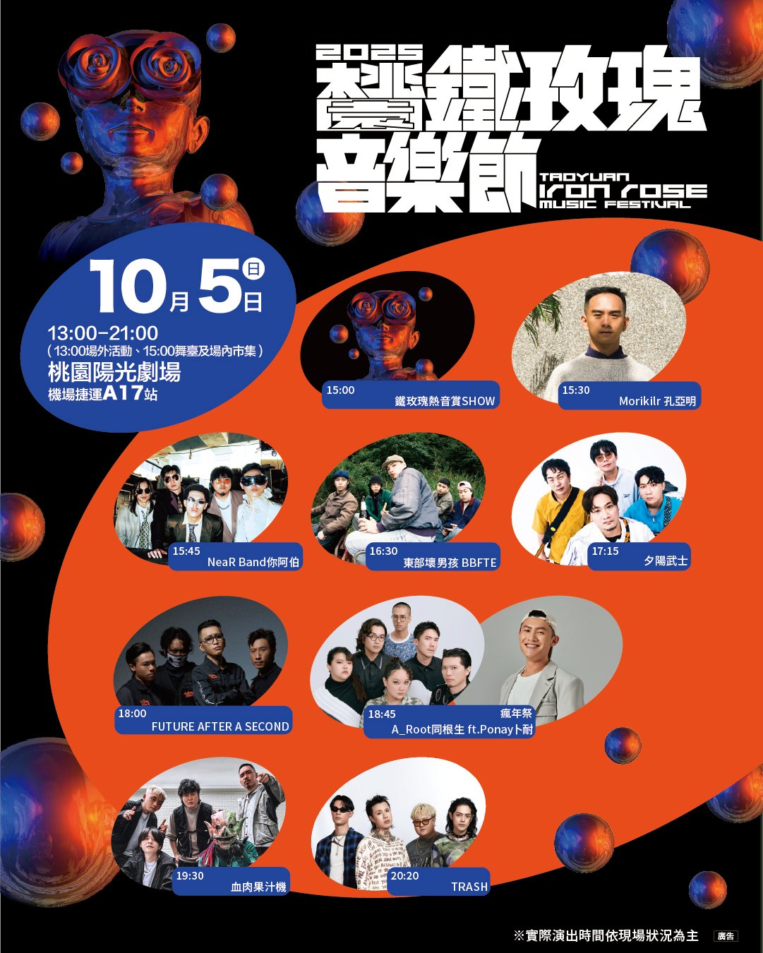 時間表線上直播搜索相片會場位置演出陣容 分享TwitterFacebookLine2025年 桃園鐵玫瑰音樂節10月4日-10月5日桃園陽光劇場2025年桃園鐵玫瑰音樂節10月4日(六)-10月5日(日)2025年桃園鐵玫瑰音樂節將在台灣舉辦,為期2天,最多一天有1個舞台,共有18個演出。官方網站InstagramFacebook直播平台:Facebook - 桃園鐵玫瑰音樂節Youtube - 桃園鐵玫瑰音樂節訂閱2025年桃園鐵玫瑰音樂節(Taoyuan Iron Rose Music Festival 2025),最完整的演出名單陣容、電視直播資訊、線上直播、節目表、時間表、會場地圖、場地資訊、Live Stream、Lineup、Set Times、Timetable和Schedule都在這裡。時間表第1天10月4日(六)13:00第2天10月5日(日)13:00線上直播第1天10月4日(六)13:00第2天10月5日(日)13:00搜索桃園陽光劇場10/0520:20TRASH桃園陽光劇場10/0519:30血肉果汁機桃園陽光劇場10/0518:45瘋年祭 A_Root同根生 ft. Ponayト耐桃園陽光劇場10/0518:00FUTURE AFTER A SECOND桃園陽光劇場10/0517:15夕陽武士桃園陽光劇場10/0516:30東部壞男孩 BBFTE桃園陽光劇場10/0515:45NeaR Band你阿伯桃園陽光劇場10/0515:30Morikilr 孔亞明桃園陽光劇場10/0515:00鐵玫瑰熱音賞SHOW桃園陽光劇場10/0420:20高爾宣OSN桃園陽光劇場10/0419:25青春未來式 ARKis + F.F.O + 桃園高中職學生街舞桃園陽光劇場10/0418:40鼓鼓 呂思緯 ft. 白安12相片海報時間表時間表會場位置桃園陽光劇場 Google Maps桃園市大園區領航北路四段216號演出陣容第1天楊肅浩沈默紳士梁河懸HowZ陳華裴安呂思緯白安高爾宣ARKisF.F.O第2天孔亞明你阿伯東部壞男孩夕陽武士FUTURE AFTER A SECOND血肉果汁機TRASH同根生卜耐🔥2025年桃園鐵玫瑰音樂節第1天時間表第2天時間表直播平台 - Facebook - 桃園鐵玫瑰音樂節直播平台 - Youtube - 桃園鐵玫瑰音樂節會場位置(Google Maps) - 桃園陽光劇場