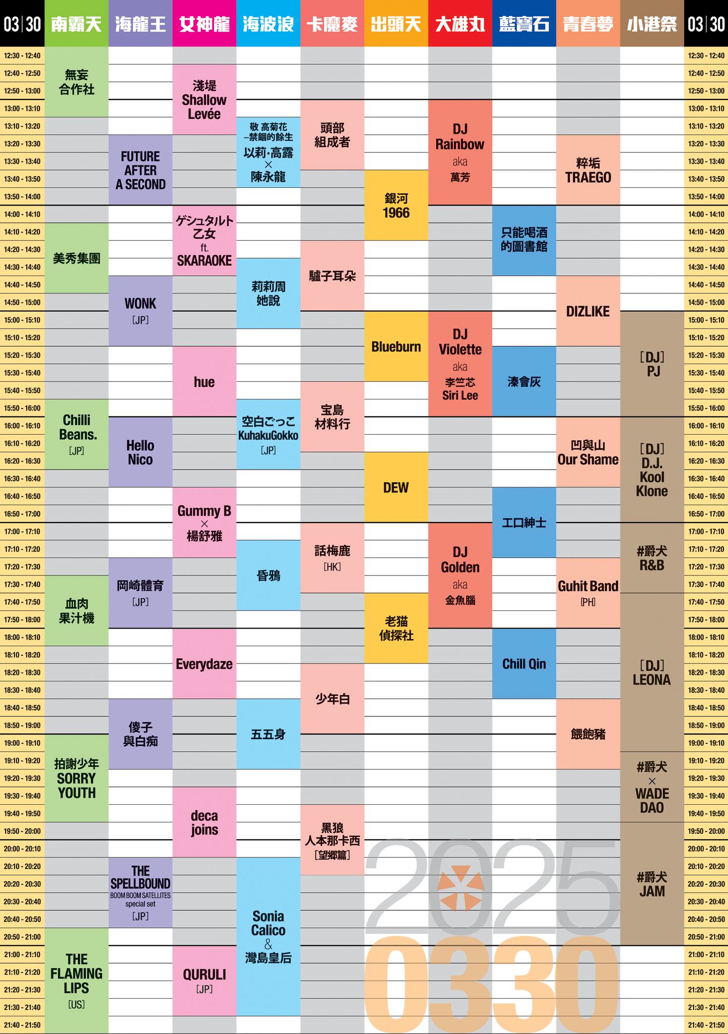 首頁全部活動2025年大港開唱第2天全部舞台舞台全部舞台南霸天海龍王女神龍海波浪卡魔夢出頭天大雄丸藍寶石青春夢小港祭大樹下依舞台時間表依舞台依時間演出陣容線上直播2025年大港開唱第2天3月30日(日)南霸天12:30 - 13:10無妄合作社14:10 - 14:50美秀集團15:50 - 16:30Chilli Beans.JP17:30 - 18:10血肉果汁機19:00 - 19:50拍謝少年 SORRY YOUTH20:50 - 21:50THE FLAMING LIPSUS海龍王13:20 - 14:00FUTURE AFTER A SECOND14:40 - 15:30WONKJP16:00 - 16:40Hello Nico17:20 - 18:00岡崎體育JP18:40 - 19:20傻子與白痴20:10 - 20:50THE SPELLBOUND BOOM BOOM SATELLITES special setJP女神龍12:40 - 13:20淺堤 Shallow Levee14:00 - 14:40ゲシュタルト 乙女 ft. SKARAOKE+115:20 - 16:00hue16:40 - 17:20Gummy B x 楊舒雅+118:00 - 18:40Everydaze19:30 - 20:10deca joins21:00 - 21:40QURULIJP海波浪13:10 - 13:50敬 高菊花 - 禁錮的餘生 以莉·高露 x 陳永龍+114:30 - 15:10莉莉周她說15:50 - 16:30空白ごっこ KuhakuGokkoJP17:10 - 17:50昏鴉18:40 - 19:20五五身20:10 - 21:40Sonia Calico & 灣島皇后+1卡魔夢13:00 - 13:40頭部組成者14:20 - 15:00驢子耳朵15:40 - 16:20宝島材料行17:00 - 17:40話梅鹿HK18:20 - 19:00少年白19:40 - 20:20黑狼人本那卡西[望郷篇]出頭天13:40 - 14:20銀河196615:00 - 15:40Blueburn16:20 - 17:00DEW17:40 - 18:20老貓偵探社大雄丸13:00 - 14:00DJ Rainbow aka 萬芳15:00 - 16:00DJ Violette aka 李竺芯 Siri Lee17:00 - 18:00DJ Golden aka 金魚腦藍寶石14:00 - 14:40只能喝酒的圖書館15:20 - 16:00溱會灰16:40 - 17:20工口紳士18:00 - 18:40Chill Qin青春夢13:20 - 14:00粹垢 TRAEGO14:40 - 15:20DIZLIKE16:00 - 16:40凹與山 Our Shame17:20 - 18:00Guhit BandPH18:40 - 19:20餵飽豬小港祭15:00 - 16:00[DJ] PJ16:00 - 16:40[DJ] D.J. Kool Klone16:40 - 17:30#爵犬 R&B17:30 - 18:10[DJ] LEONA18:10 - 19:40#爵犬 x WADE DAO19:40 - 21:00#爵犬 JAM大樹下15:00 - 15:50Koala Wu15:50 - 16:10Karei & ooo & 稲妻莉央16:10 - 17:00Samuel Mie17:00 - 18:00空耳卡拉OK18:00 - 19:00Roman ft. EvolutioN資料來源查看高清圖