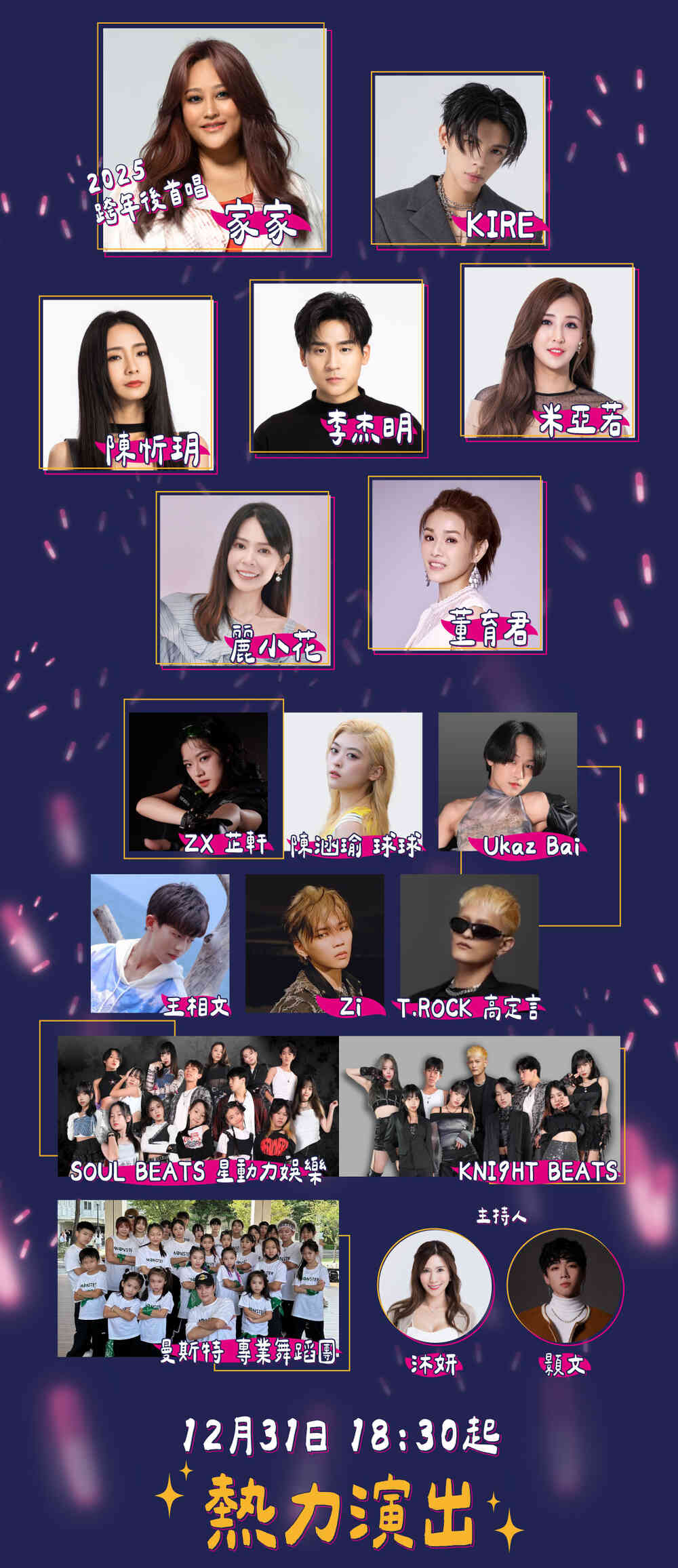 2025超越快樂-摩天輪跨年煙火秀12月31日(二)2025超越快樂-摩天輪跨年煙火秀將在台灣舉辦,為期1天。 2025超越快樂-摩天輪跨年煙火秀,最完整的演出名單陣容、電視直播資訊、線上直播、節目表、時間表、會場地圖、場地資訊、Live Stream、Lineup、Set Times、Timetable和Schedule都在這裡。相關連結:官方網站Facebook官方網站Facebook 分享TwitterFacebookLine會場位置演出陣容活動日期2024年12月31日(二)入場時間:18:30首頁全部活動2025超越快樂-摩天輪跨年煙火秀會場位置劍湖山世界主題樂園 Google Maps雲林縣古坑鄉67號演出陣容陳忻玥KIRE凱爾家家李杰明活動將有陳忻玥、KIRE凱爾、家家、李杰明等知名表演者目前公布的演出陣容共有18組,詳情如下:家家KIRE凱爾陳忻玥李杰明米亞若麗小花董育君ZX芷軒陳涵瑜UKAZ BAI王相文ZIT.ROCK高定言SOUL BEATS星動力娛樂KNI9HT BEATS曼斯特專業舞蹈團沐妍顥文家家KIRE凱爾陳忻玥李杰明米亞若麗小花董育君ZX芷軒陳涵瑜UKAZ BAI王相文ZIT.ROCK高定言SOUL BEATS星動力娛樂KNI9HT BEATS曼斯特專業舞蹈團沐妍顥文如需了解2025超越快樂-摩天輪跨年煙火秀的完整演出陣容,請參考下方圖片,內容以官方最新更新為準。查看高清圖