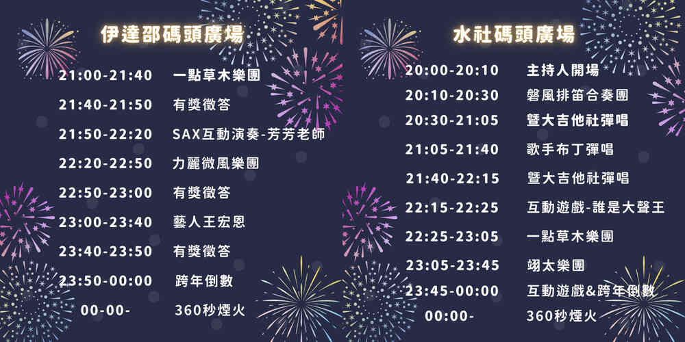 2025日月潭跨年晚會12月31日(二)-1月1日(三)2025日月潭跨年晚會將在台灣舉辦,為期2天。 2025日月潭跨年晚會,最完整的演出名單陣容、電視直播資訊、線上直播、節目表、時間表、會場地圖、場地資訊、Live Stream、Lineup、Set Times、Timetable和Schedule都在這裡。相關連結:官方網站官方網站 分享TwitterFacebookLine會場位置演出陣容時間表活動日期第1天2024年12月31日(二)第2天2025年1月1日(三)首頁全部活動2025日月潭跨年晚會會場位置南投縣魚池鄉日月潭周邊轄區演出陣容目前公布的演出陣容共有8組,詳情如下:翊太樂團王宏恩磐風排笛合奏團暨大吉他社布丁一點草木樂團芳芳老師力麗微風樂團翊太樂團王宏恩磐風排笛合奏團暨大吉他社布丁一點草木樂團芳芳老師力麗微風樂團時間表2025日月潭跨年晚會的時間表已公布,下方圖片可查看,資訊以官方最新更新為依據。查看高清圖