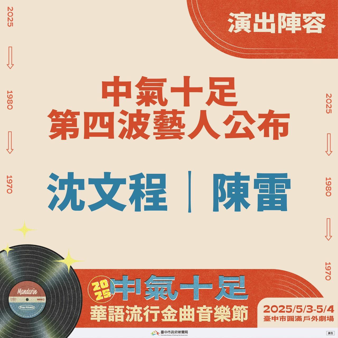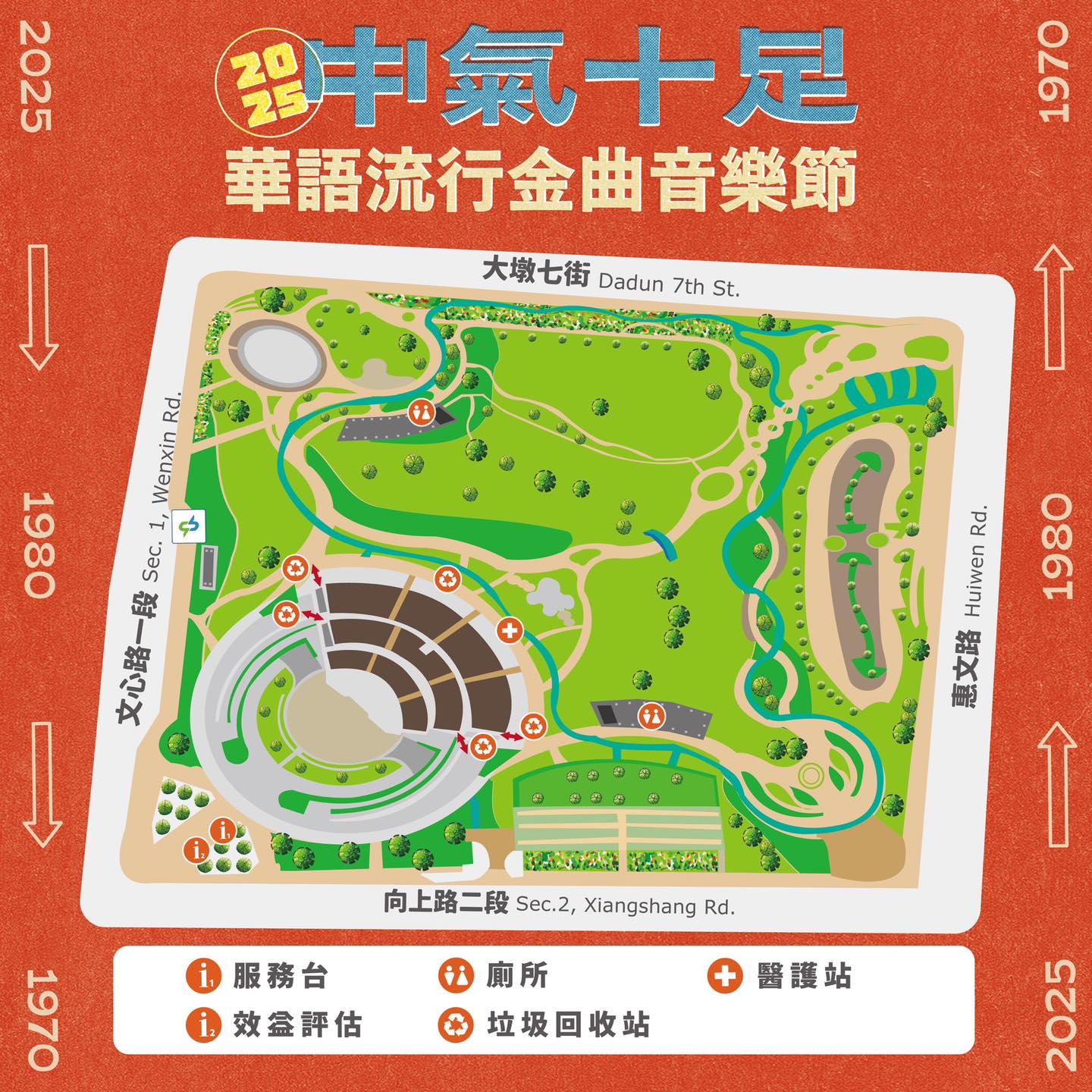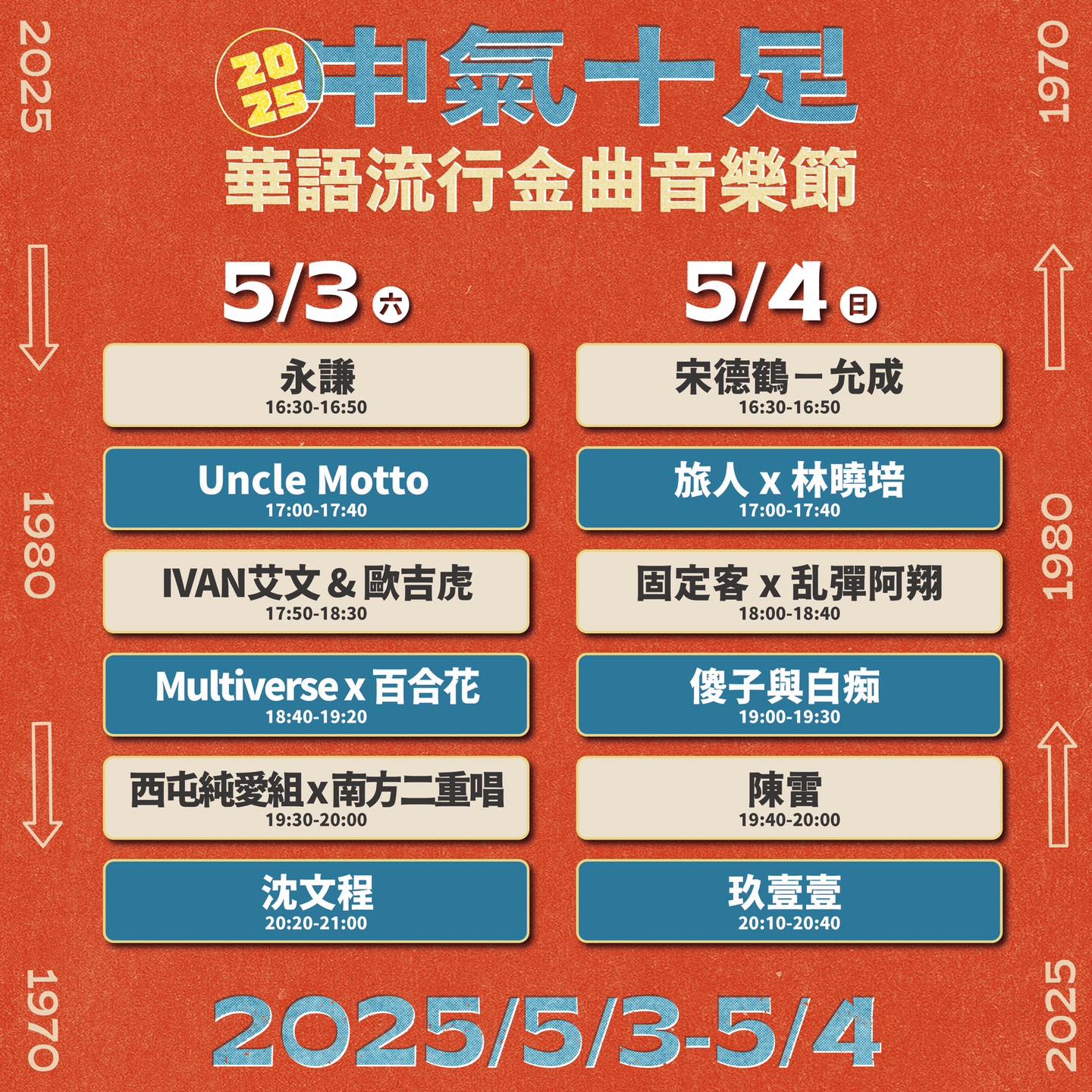 時間表線上直播搜索相片會場位置演出陣容 分享TwitterFacebookLine2025年中氣十足5月3日-5月4日文心森林公園2025年中氣十足5月3日(六)-5月4日(日)2025年中氣十足將在台灣舉辦,為期2天,最多一天有1個舞台,共有12個演出。InstagramFacebook直播平台:Youtube - 三立新聞網SETN訂閱2025年中氣十足,最完整的演出名單陣容、電視直播資訊、線上直播、節目表、時間表、會場地圖、場地資訊、Live Stream、Lineup、Set Times、Timetable和Schedule都在這裡。時間表第1天5月3日(六)16:30第2天5月4日(日)16:30線上直播第1天5月3日(六)16:30第2天5月4日(日)16:30搜索圓滿戶外劇場05/0420:10玖壹壹圓滿戶外劇場05/0419:40陳雷圓滿戶外劇場05/0419:00傻子與白痴圓滿戶外劇場05/0418:00固定客 x 亂彈阿翔圓滿戶外劇場05/0417:00旅人 x 林曉培圓滿戶外劇場05/0416:30宋德鶴 - 允成圓滿戶外劇場05/0320:20沈文程圓滿戶外劇場05/0319:30西屯純愛組 x 南方二重唱圓滿戶外劇場05/0318:40Multiverse x 百合花圓滿戶外劇場05/0317:50IVAN艾文 & 歐吉虎圓滿戶外劇場05/0317:00Uncle Motto圓滿戶外劇場05/0316:30永謙1相片海報演出陣容時間表會場地圖會場位置文心森林公園 Google Maps台中市南屯區文心路一段289號演出陣容第1天永謙UNCLE MOTTO艾文歐吉虎MULTIVERSE百合花西屯純愛組南方二重唱沈文程第2天允成Traveller旅人林曉培固定客乱彈阿翔傻子與白痴陳雷玖壹壹🔥2025年中氣十足第1天時間表第2天時間表直播平台 - Youtube - 三立新聞網SETN會場位置(Google Maps) - 文心森林公園會場地圖