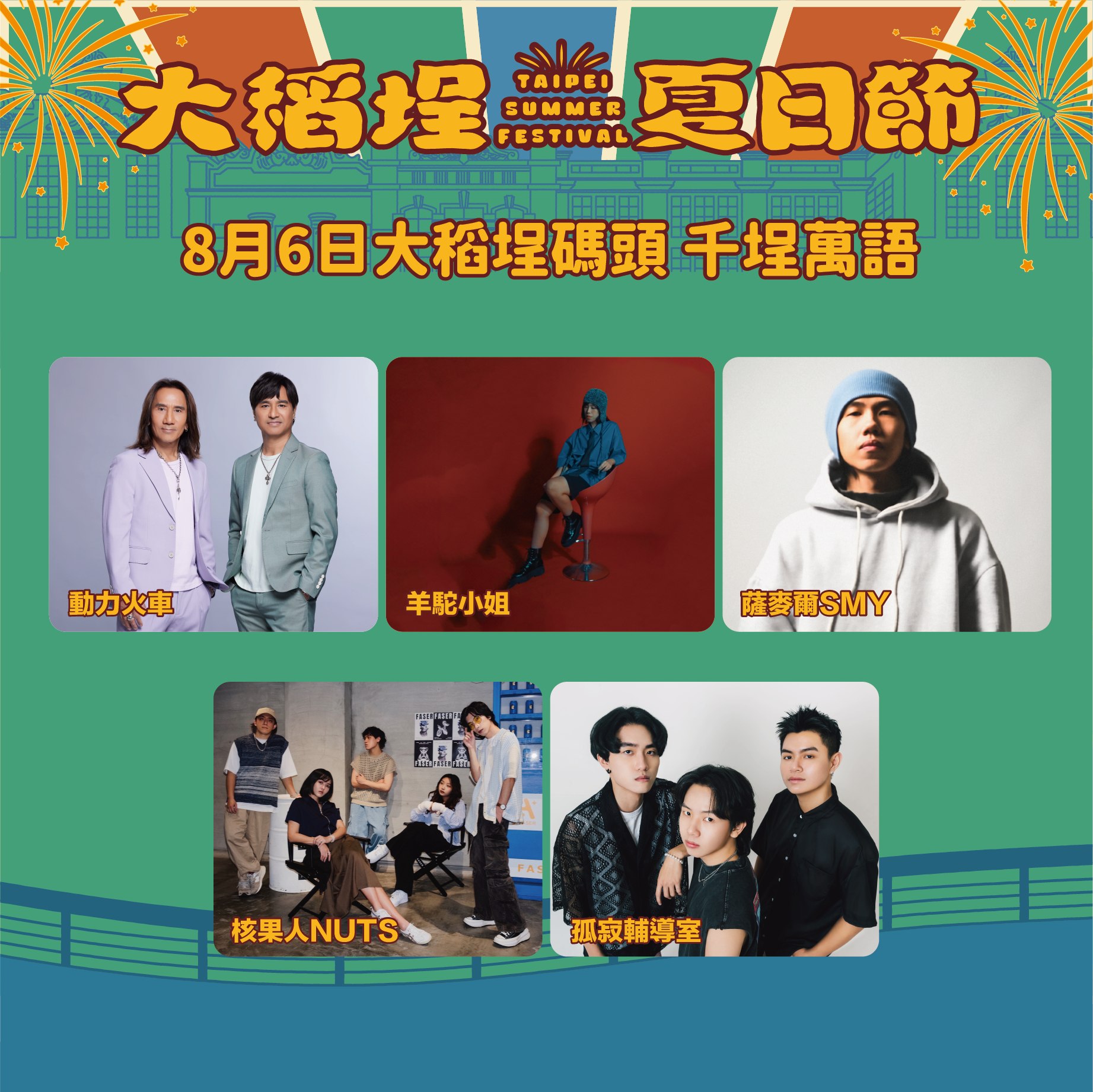 時間表線上直播搜索相片會場位置演出陣容 分享TwitterFacebookLine2025年大稻埕夏日節8月6日-8月30日大稻埕碼頭2025年大稻埕夏日節8月6日(三)-8月30日(六)2025年大稻埕夏日節將在台灣舉辦,為期4天,最多一天有2個舞台,共有30個演出。官方網站直播平台:Youtube - 臺北市政府Youtube - Vidol TV三立新聞網直播室Facebook - 台北旅遊網Facebook - 我是台北人訂閱2025年大稻埕夏日節(Taipei Summer Festival 2025),最完整的演出名單陣容、電視直播資訊、線上直播、節目表、時間表、會場地圖、場地資訊、Live Stream、Lineup、Set Times、Timetable和Schedule都在這裡。時間表第1天8月6日(三)18:00第2天8月13日(三)18:00第3天8月20日(三)16:30第4天8月30日(六)15:00線上直播第1天8月6日(三)18:00第2天8月13日(三)18:00第3天8月20日(三)16:30第4天8月30日(六)15:00搜索大稻埕碼頭08/3021:00宇宙人大稻埕碼頭08/3020:10怕胖團大稻埕碼頭08/3020:00「愛情來得正是時候」煙火秀大稻埕碼頭08/3019:30陳華大稻埕碼頭08/3018:50溫室雜草大稻埕碼頭08/3018:20呂允大稻埕碼頭08/3017:40公館青少年大稻埕碼頭08/3017:10胡恂舞大稻埕碼頭08/3016:30蕎Chiao大稻埕永樂廣場08/3016:20粗大Band大稻埕永樂廣場08/3015:40打倒三明治大稻埕永樂廣場08/3015:00Tickle Tickle癢癢123相片海報演出陣容會場地圖會場位置大稻埕碼頭 Google Maps台北市大同區民生西路演出陣容第1天動力火車羊駝小姐薩麥爾核果人NUTS孤寂輔導室第2天眠氣紙鳶伯爵白桑尼第3天紙鳶伯爵白Denzel Cheng固定客你阿伯沈默紳士第4天打倒三明治粗大BandTickle Tickle 癢癢怕胖團陳華宇宙人溫室雜草SABRINA胡恂舞呂允蕎公館青少年🔥2025年大稻埕夏日節第1天時間表第2天時間表第3天時間表第4天時間表直播平台 - Youtube - 臺北市政府直播平台 - Youtube - Vidol TV直播平台 - 三立新聞網直播室直播平台 - Facebook - 台北旅遊網直播平台 - Facebook - 我是台北人會場位置(Google Maps) - 大稻埕碼頭會場地圖