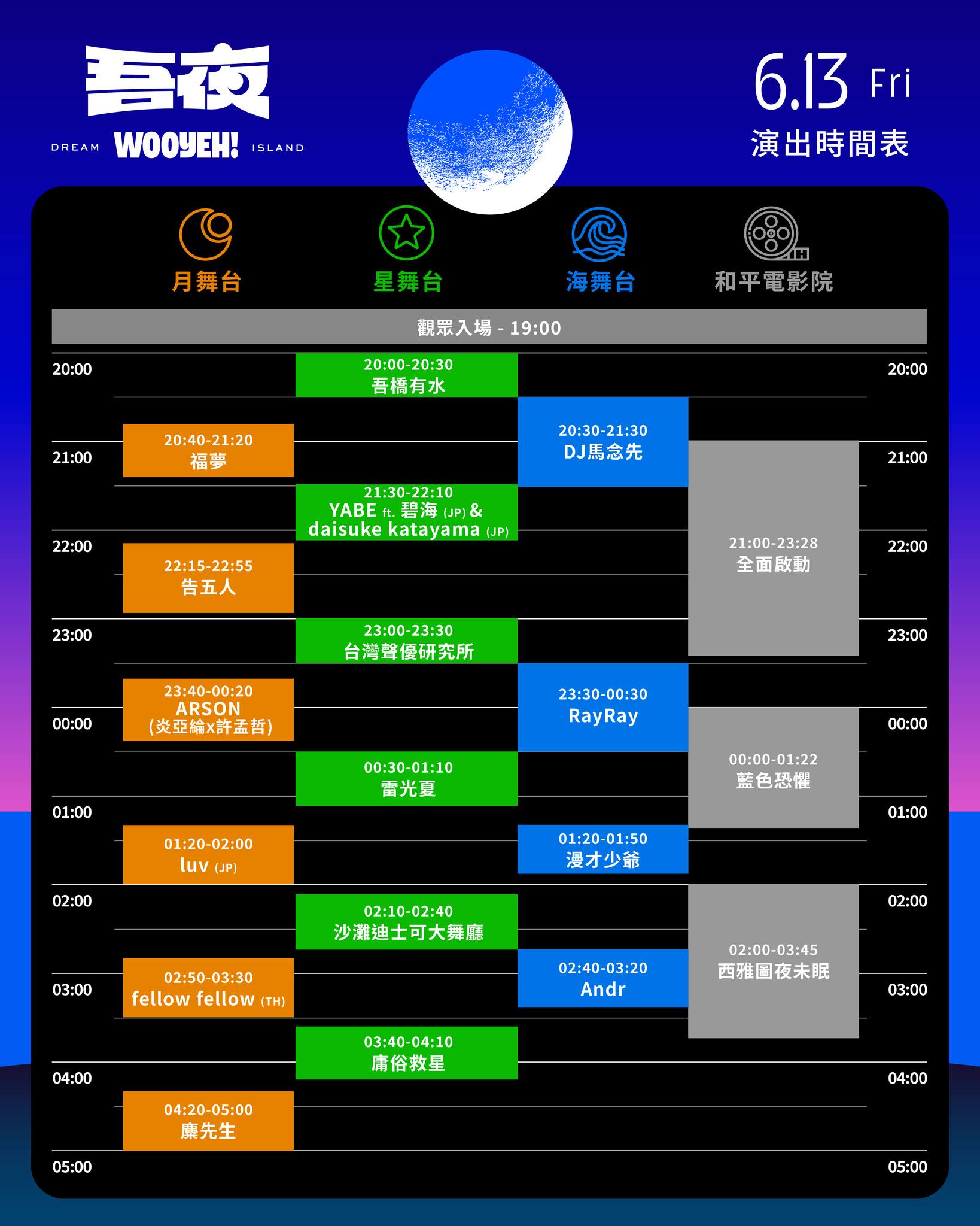 首頁全部活動2025年吾夜生活節第1天全部舞台舞台全部舞台月舞臺星舞臺海舞臺和平電影院依舞台時間表依舞台依時間演出陣容線上直播2025年吾夜生活節第1天6月13日(五)月舞臺20:40 - 21:20福夢22:15 - 22:55告五人23:40 - 00:20ARSON(炎亞綸 x 許孟哲)+106/1401:20 - 02:00luvJP06/1402:50 - 03:30fellow fellowTH06/1404:20 - 05:00麋先生星舞臺20:00 - 20:30吾橋有水21:30 - 22:10YABE ft. 碧海 & daisuke katayamaJP+223:00 - 23:30台灣聲優研究所06/1400:30 - 01:10雷光夏06/1402:10 - 02:40沙灘迪士可大舞廳06/1403:40 - 04:10庸俗救星海舞臺20:30 - 21:30DJ 馬念先23:30 - 00:30RayRay06/1401:20 - 01:50漫才少爺06/1402:40 - 03:20Andr和平電影院21:00 - 23:28全面啟動06/1400:00 - 01:22藍色恐懼06/1402:00 - 03:45西雅圖夜未眠資料來源查看高清圖